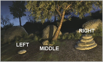 This is a basic version of the well known Towers of Hanoi puzzle. There are three areas (left, middle and right) where rock piles can be assembled. The top rock from any pile can be moved onto either of the other two piles, providing it is smaller than the current rock at the top of the pile it is moved to. Your goal is to assemble all the rocks in the middle area so that you can climb up the tree.