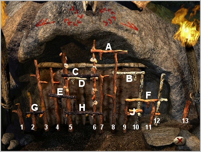 | Study the gate carefully, noting that the two centre poles (5 and 6) have decorations on them and they also cannot be rotated. The area between these two poles must be cleared to open the gate, so bars C, D, E and H must be moved. In order to do this the other bars must first be moved out of the way. |