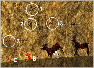 | First figure out all the controls. The 'X' near the top (1) is a reset button and restores the fresco to it's original position. The double arrow (2) is a play button and starts the 'movie'. Note that the movie stops if it reaches a frame (stag) that is not correctly co-ordinated, either an incorrect position or colour. The single arrows (3) above each stag are used to change it's position. The stags above the water can be manipulated into 5 different positions: two facing upward, two facing downward and level. The submerged stags only move into 4 different positions, but as you will see later, these are irrelevant. The stags can be changed into one of three colours (dark red, bright red and orange) by clicking them. These colours are illustrated in the graphic with stags A, B and C. | |||||||||||||||||||||||