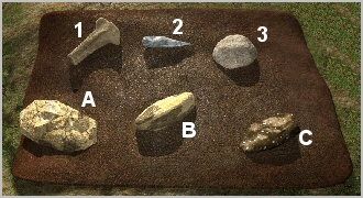 | In appreciation for the meal Toar gives you a lesson in flint knapping. The tools are numbered 1, 2, 3 (in the diagram) and the flints are A, B and C. Note that after picking up and replacing one of the tools, descriptions of all the tools are displayed when the cursor hovers over them. | ||||||||||||