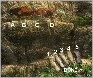 | Note that the bisons above the symbols are the same reddish colour as that of the symbols, obviously the key to what must be done with the symbols - all four must be red. The first note from stone 4 turns A to red, the second note from stone 2 turns B to red, the third note from stone 5 turns C to red and the fourth note from stone 1 turns D to red. Strike the stones in that order (4 2 5 1) to activate the cave entrance to Tika's dwelling. | ||||||||||||