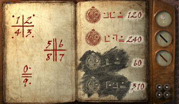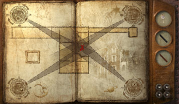 Bed - Note the geometric shapes on top part of the posts of the bed. They must have a meaning. Take the mirror from the Venetian cabinet left of the fireplace. There's a charcoal crayon right of the bed if needed. Take the sheet of paper from the side table. It has the triangles from the posts of the bed. Look at it in inventory and click-add it to the portfolio. At the portfolio, use the mirror and see that they are the signs for fire, air, water and earth. Flip to the previous page of the portfolio and see that the back of the paper has indentations made by handwriting. Use the charcoal crayon on that page. Read the translation at the bottom of the screen.