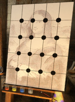 Colored Mona Lisa - Click on a square to turn the charcoal to colors. The object of the puzzle is to reform the Mona Lisa. Click to turn all the frames in to colors. Then using the black dots move the squares into the correct position. Once the colored square is in the correct position, click on that square to turn it to white and see if they are the same as the original charcoal drawing.