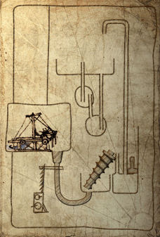 Sheet of paper - Move the cursor over the picture to identify the different parts. The water pump is to the left inside the square. Below that is the jack that linked to a system of pools. The Archimedes screw pumps water from the pipe to water pump to the perforated tank above. The lines and broken circles at top left are glass tubes and flasks.