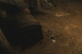 Exit the study and bedroom. Go forward to the balcony. Take pebbles from the floor before the stairs. Go down the stairs and go forward. Take the left path away from the manor and tracks.