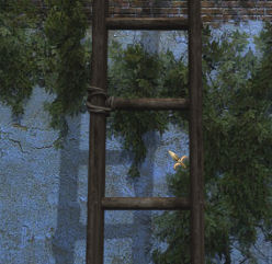 b. Pan down and look at the ladder leaning on the wall. See that one rung is off. Use the link taken from the workroom on the loose rung. Then climb up. (Thanks, Benoit.)