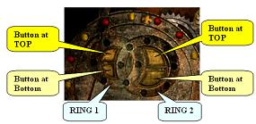 the dialog will automatically follow. The Four Signs Puzzle It's time to use the King's key to decode the marks we found in the two cellars. So go to those two pages in the Portfolio. Examine the key on the LEFT page. Note the numbers 1-4 around the symbol in the upper left-hand corner of the page. Note also that this one symbol is in fact a combination of four symbols, each adjacent to a number from 1 to 4. Thus, each symbol represents the number that is closest to it. We find the symbols representing the numbers 5-8 and 9-0, in the same way. Look at the marks on the RIGHT page now. There are four rows, each of which begins with a circular drawing on the left, followed by two or three symbols. Note the image of a heavenly body inside each circular drawing. So let's refer to each drawing by the object in it. Thus, going from the top to the bottom of the page, we have the SUN, the STAR, the MOON and Saturn, i.e., the PLANETS. Pick up the Blood Stone, from the right of the Portfolio, and it will appear as your cursor. Click on the first symbol after the Sun drawing, on the right page; and then, click on number 1, on the left page. Since this is a correct match, a white space will appear at the end of the row. Click in this white space, to see number 1 appear in it. Click on the second symbol now; then on number 2; and then, on the white space. Since this is also a correct match, number 2 will appear in the white space. Finally, click on the third symbol; then on number 0; and then, on the white space, to see number 0 appear in it. Thus, you will now have 120 in the white space at the end of the first row. Proceed in the same way for the other rows, to obtain the following results: Row 1: SUN ----------------- 120 Row 2: STAR --------------- 240 Row 3: MOON -------------- 60 Row 4: PLANETS