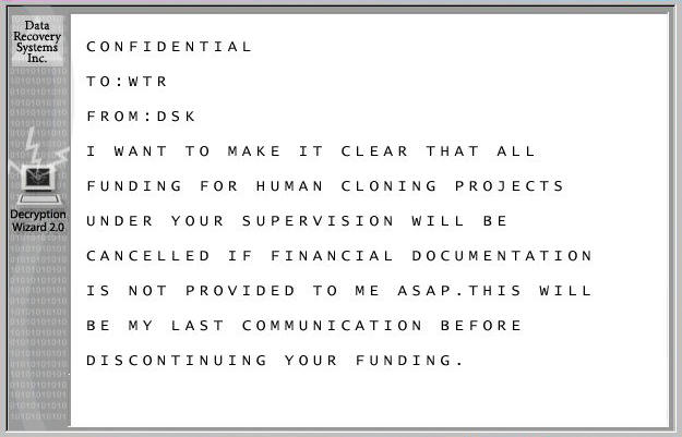 “I want to make it clear that all funding for human cloning projects under your supervision will be cancelled if financial documentation is not provided to me ASAP. This will be my last communication before discontinuing your funding."