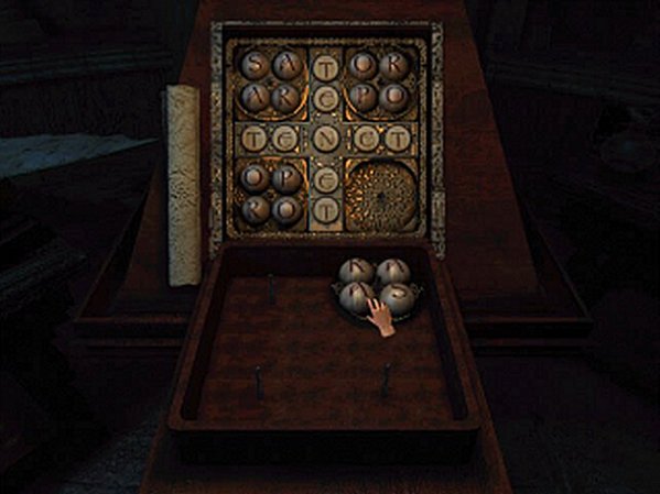 The Ball Puzzle ~ Place the balls in the top area to spell out SATOR across the top row. The balls should spell out ROTAS across the very bottom row. Take the Cross. Leave this room and go down the stairs to the recess in the wall straight ahead.