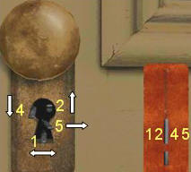 Fresco puzzle: There are hidden drawings and letters on the fresco. Move the lit candle on the fresco very slowly. When the start of the hidden drawings starts to be seen, move the candle very slowly to highlight all the parts of the hidden drawing. At a certain spot in that drawing, the sketchbook will appear at bottom right of the page showing that Gus drew that particular hidden drawing and should not appear anymore. If the sketchbook does not appear move the candle over again very, very slowly and sometimes hold it in place to get Gus to draw it. Patience! The yellow X on the picture below is approximately where the sketchbook shows up.