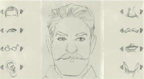 Drawing of the suspect: Take the sketchbook from inventory. Based on the descriptions of Isidore, Mrs. Loiseau and Nicholas draw the suspect's face by cycling through the different features. No glasses, small dark eyes, large mouth, thin lips, boxer's nose, square face, short straight hair, flat medium sized ears, black moustache, square face and dreadful eyes. Then click sketch portrait. Talk to Nicholas to show the picture. If it is correct, Nicholas will verify it. Show the sketch to Petit also but he will just get outraged even if it is wrong or right. Show it also to Mrs. Loiseau - there is a resemblance but no evil in him.