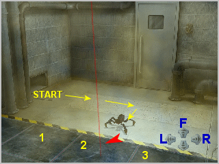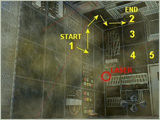 Study the laser's movement along these tiles and note that it sweeps along the path you must follow, then to the right and up along the bank of tiles to the right of the path. You therefore start moving the spider as soon as the laser begins its downward sweep from the tile indicated in the graphic. Also, as only the FORWARD arrow is needed, just keep the mouse button pressed on the arrow.