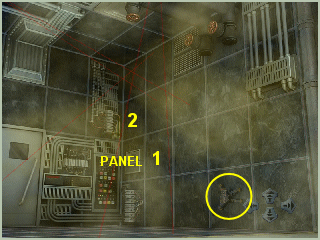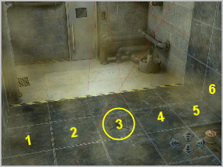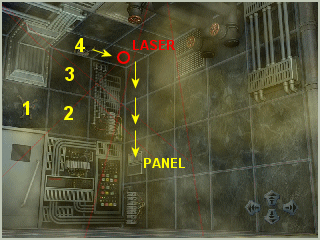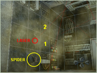 The main security panel can only be accessed from tiles 1 or 2. Again, study the laser movement and note the activity over tile 1 and the one directly above it. The laser movement over these tiles is far too rapid to allow you to get a spider across them. This means that the only route to the main panel is to approach tile 2 from the tile above it. You therefore have to use the opposite wall to get the spider to a position above tile 2. Also, note that the tile above the door is 'neutral' - this comes in handy later.