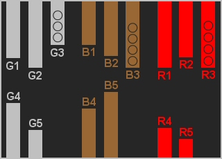 | The tumblers are divided into 3 sections - grey, brown and red. Each section has 5 tumblers, 3 at the top and 2 at the bottom. The 3rd tumbler in the top row of each section (marked with large dots) is that specific section's master tumbler. All the other tumblers are regular, or slave tumblers. | ||||||||||||||||||