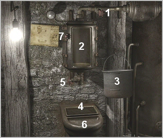 | (a) Begin by opening the top valve (1) to fill the tank (2) - it will contain 5 litres of liquid (b) Click the bucket (3) to place it on the grille (4) under the tank (c) Open the bottom valve (5) to fill the bucket from the tank (d) The bucket will now contain 3 litres of liquid, while 2 litres remain in the tank (e) Don't pick up the bucket, just click on the drain (6) to empty the bucket (f) The bucket will then automatically return to the grille under the tank (g) Open the bottom valve (5) to release the remaining 2 litres of liquid into the bucket (h) Turn the top valve (1) to again fill the tank with 5 litres of liquid (i) Open the bottom valve (5) to fill the bucket - as it already contains 2 litres, only 1 litre will be released (j) The tank will now contain exactly 4 litres of liquid (k) Finally, press the red button (7) to drain the reservoir | |||