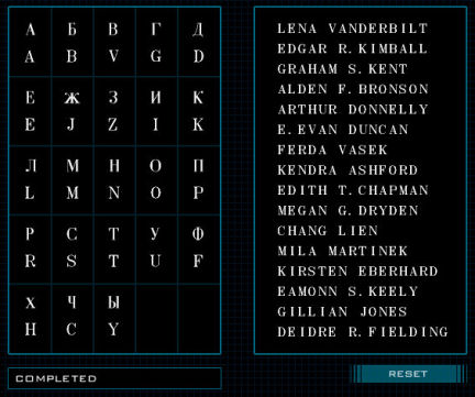 Second visit: This visit is triggered when Larissa Lukin mentions Bogdanov's grandparents. Use the elevator to go to Bogdanov's office. Look at the photo album. Take photo of the grandparents with the baby. Click the picture to turn the photo over. Use camera on back of photo to get Cyrillic handwritten text and 3865959.