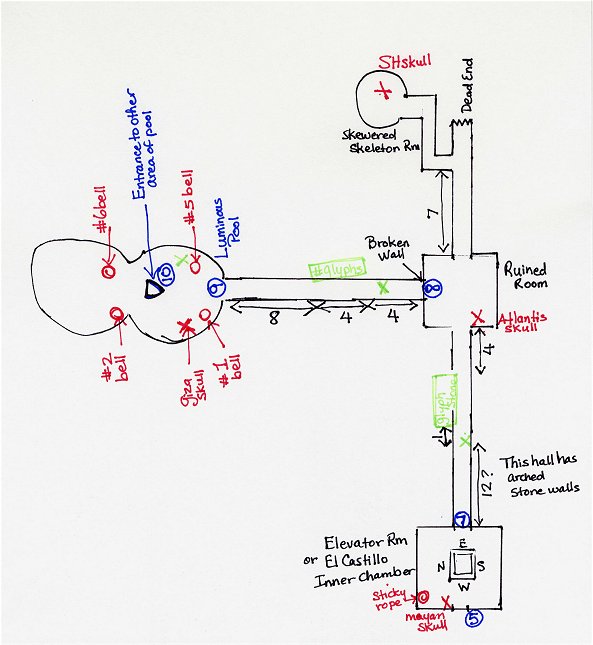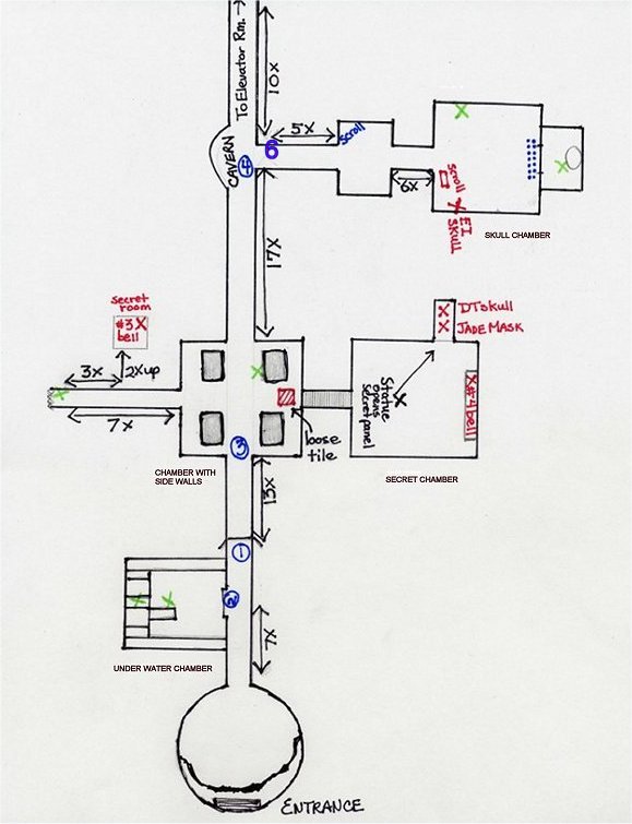 The following maps are not drawn to scale. The underground and water paths are not straight as they are drawn in the maps. The green X's represent the skulls that you will find that are not needed in the final puzzle. The red X's are the skulls you will need in the final puzzle. I wrote in red the bells and scrolls that you will also need to pick up. The circled numbers represent the pictures of the actual cave as shown in the game. These pictures are just below the map. I put the number of steps or clicks between areas, but they might be off a little depending where you start counting.