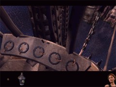 Zoom out and zoom in on the hand sign between the two wheels. Push on the hand and you'll drift away... When the island has docked, zoom out and enter the elevator once more. Push the down button. Exit the elevator. Climb up the path. Turn to the left and zoom in on the vine again. Use the device to be transported across the ocean.