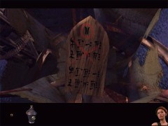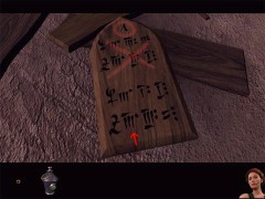 Zoom out, turn to the right and climb the stairs all the way up. Turn to the right and zoom in on the wooden planks which are lying on the floor. You'll find a wooden tablet with the same kind of signs you have seen on the pear shaped device. The upper signs are crossed out with a red mark. I wonder if these are the old coordinates this scientist was speaking of. And if the ones which aren't crossed out may be the new coordinates. Make a note of these coordinates!