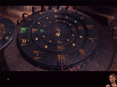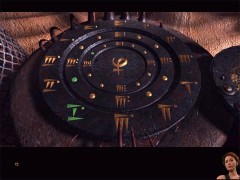 Walk into the elevator and push the up button. Turn to the left and exit the elevator. Walk to the two big wheels you'll see in this room. Zoom in on the wheels and you'll see familiar signs. Your goal is to highlight the correct new coordinates on both wheels which will take you to another part of the structure. Because you don't have all signs to all coordinates you can use some dots instead of that signs. Just imagine the wheels as a big clock.