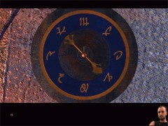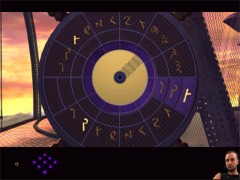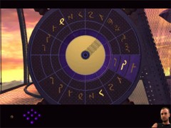 Zoom out and turn to the right. Walk towards the big wheel shape device. Zoom in on the blue pedestal at the left of the device. It's another mission log. Zoom in and switch it on. You'll get a brief message this time from Dr. Hovis. Zoom in on the wheel and you'll see the same signs as on the compass.