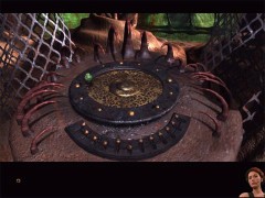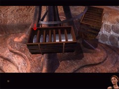 When finished, zoom out. Turn to the right and enter the elevator. Push the down button. Exit the elevator and climb up the path. Look at the left and voila, the tentacle with the chair. Use the chair to cross the ocean.