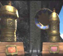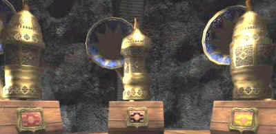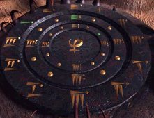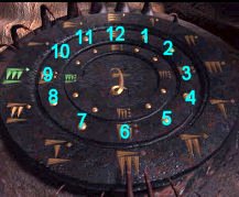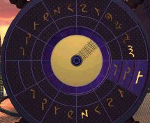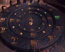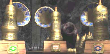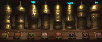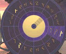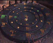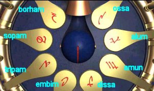Go back to the fish balloon, go to the right chair and look close at steering mechanism. For each set of icons, starting from the inner blue lighted icon - turn the left handle to the first icon, move the top arch indicator to match the lit icon on top of the blue disk and move the right handle to match the lit icons on the bottom of the blue disk. Do this for all the 3 blue lighted icons on the blue disk. Press the middle button. Oh, I love riding on air and the view is just wonderful! Temple by Bosch Tunnel - Sam Get off the fish balloon and now be in contact with Hannah. After catching up on all the happenings, go down stairs on the right, forward, right, left and enter the elevator. Click on handle on the left post, go out to the metal ramp, forward 8x, left, forward, pan right and click on button on right of lotus door. Move forward until the landing of the main temple. Turn left, forward and see the Science Base. Turn left again, forward, pan left, look close at pillar and press button to call the rail car. Enter car and click on the right knob (it's the only one not destroyed). Move forward through dark tunnel and forward at the center of the prayer grinder/wheels. Click on prayer wheels and take note of the sounds. The first word is that of the wheel - note the designs of the prayer wheels to match that sound. The next word of the sound is that of the colored plate - note sound to match the color of the plate. The colored plates can be changed by moving it up or down. The sounds below are only approximations.