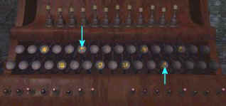 Come out of the right house into the night. Walk towards the bridge and see a woman looking up to the left. She says the decision is yours the Wanderer or the Good Servant. Didn't Dr. Santo say that they're one and the same? Wanderer, new name of Good Servant or this a choice between old and new future? Look at what she's looking at. Look up to the left. It looks like the knobs on the top portion of the computer setup at Bosch Tunnel. Take note of sequence of which ones are raised out of the 12 lights. From left to right - 1, 5, 7, 8, 10, 12.