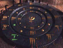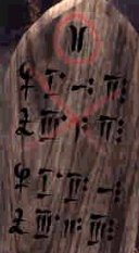 Exit between yellow and green prayer wheels and go back to the temple via the rail car. Explore the rest of the landing. Go to the other side of the stairs and see a drawing on the wall of the temple. Pan right, forward, walk wire bridge that goes to a round shaped console. Look close at console. While sitting down, look across beyond the console to a metal pillar. Look down, click knob and examine the different parts of the console - the dumbbell like icon and the white graduated panel. Note that the chair can be rotated right and left while sitting on the console. In doing so, see 5 of those pillars around the area. Move back to get off the chair and go back to the dark temple entrance. Enter the temple proper and see a large pool at the center of the complex. Turn left, forward 2x and note the prayer wheels on the left. Continue down the hallway to the end, turn right, climb stairs, left and enter room. Note the bee tablet below the picture of the Oriental monk similar to the one behind the Living Ship's pear shaped bottle. On the left side of the altar on the wall is a plaque that shows the icon for #9 at the center. Exit the room and turn left to continue exploring. Go down the stairs, turn right, forward, note the prayer wheels on the left, forward 2x and see stairs on the left. Climb stairs, turn right and forward to the second floor. Turn right, forward 3x, pan right and see a blank mission log. Turn right, go forward once, turn left and enter the dark room. On the right wall is a mural, take note of the parts of the drawing. The pillar on the right is similar to the ones outside the temple by the round console. The scientist is sitting in front of the console like what we did. The markings on bottom line of the triangle matches the one on the console and is divided into two parts. The marking on the right side of the triangle matches that on the wall of the temple. Turn around and see a console. Look close at the console. There are 5 of those pillars on the top and 5 white graduated panels similar to the console's white graduated panel. So, each of the white graduated panels are for each of the 5 pillars. Go back outside the temple to the real console.