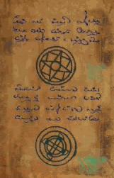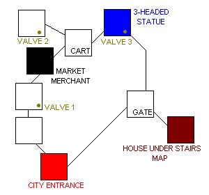 The 3-headed statue in the fountain acts as a universal translator. Approach the statue from the right (a loud ringing of bells is heard in the background) and "click" the head facing you until the BING BONG sound is heard. Next approach the statue from the rear (the wind is heard howling in the background) and "click" the head facing you until the SHOO sound is heard. The sound from the 3rd head is set by "trial and error". You are now able to communicate with all the characters.