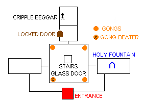 Talk to the cripple beggar – he asks for water. This ‘activates’ a BOWL OF WATER at the HOLY FOUNTAIN. Fetch the BOWL OF WATER and give it to the cripple beggar. In return he gives you his CRUTCH.