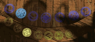 Certain of the ‘stones’ have strange symbols on them. Only one symbol is common to all 3 these frames and does NOT appear on the others. It is also the only symbol on the 4th row of the ‘stones’. Press the stone with this symbol in all 3 the frames – this activates THE ALCHEMY WORKSHOP.