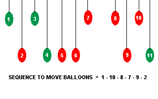 The lift mechanism must be adjusted to get the lift to go down. The 11 red and green balloons control the mechanism. The alchemist gives a clue to the settings of the balloons when he says "greens up…". All the green balloons must be at the top, and the red ones at the bottom. When "clicking" on a particular balloon, certain other balloons will also move.