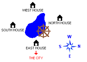 There is a house directly in front of you as you arrive at the OASIS. Talk to the man outside this house – he tells you that the city is to the east. This is therefore the EAST HOUSE.