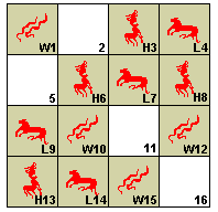 Start the game by "clicking" on the bowl containing a number of blue stones. You and the alchemist take turns in removing 1, 2 or 3 stones. Whoever removes the last stone/s wins. You always have the 1st move. If the game starts with 8 stones on the table you cannot win! If the game starts with 9, 10, or 11 stones – remove 1, 2, or 3 stones respectively, leaving 8 on the table. Depending on how many stones the alchemist takes – you next take enough stones to leave exactly 4 on the table.