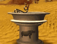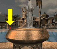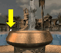 Cross the water surrounding the fountain by throwing the MEDALLION into it. The 8 receptacles around the fountain control the water flow to the various buildings along the perimeter.
