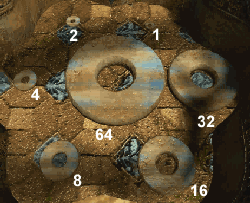 Each of the millstones in the bath next to the straw basket is double the size of the one smaller than itself. Therefore, if the smallest one is '1 unit', the next biggest is '2 units', the next '4 units' and so on. Only one combination of the millstones add up to '22 units', i.e. 2 + 4 + 16.