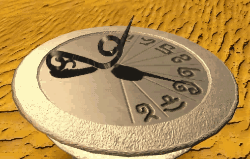 Examine the sundial at the rear of the city. It is identifiable by the "Rhino" on it. Note the symbol under the shadow.