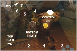 | 01) Move the bottom crate to position 1 | | 02) Fetch the top crate (from the direction indicated by the arrow) and move it to position 2 | | 03) Push the top crate (over the bottom one) to position 3 | | 04) Move the top crate, around the right side of the control unit, to position 4 | | 05) Move the bottom crate to position 5 | | 06) Push the top crate (over the bottom one) to position 6 | | 07) Move the top crate to position 7 (next to the wall) |