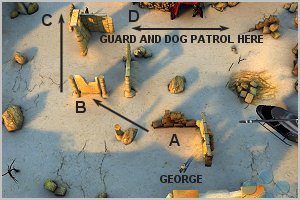 | 01) Getting from A to B can be done while the guard and his dog are at either end of their patrol | | 02) Before going to C wait for the guard and the dog to move from the left end towards the right | | 03) Only start running when both the guard and the dog are past point D | | 04) Run to point C and continue straight ahead round the left of the Temple |