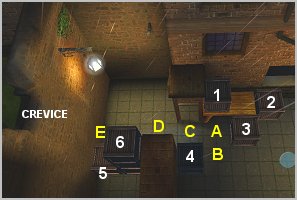 | 01) Move crate 3 to position D | | 02) Move crate 2 to position A | | 03) Move crate 4 to position B | | 04) Pull crate 1 on top of crate 2 (position A) | | 05) Move crate 4 from position B to position C | | 06) Move crate 5 next to crate 3, i.e. to the left of position D | | 07) Move crate 1 from the top of position A to the top of crate 5 (left of position D) | | 08) Move crate 3 from position D to where crate 5 was initially | | 09) Move crate 2 out of the way, i.e. to the right of position A | | 10) Move crate 4 from position C to position E | | 11) Push crate 1 on top of crate 4 (at position E) | | 12) Push crate 1 from the top of crate 4 to the top of crate 3 (crate 5 was initially) | | 13) Push crate 6 on top of crate 1, i.e. next to the wall below the crevice |