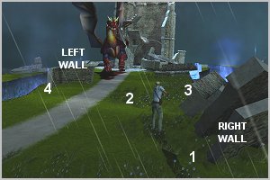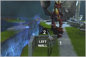 | 01) From behind the wall (position 1) run towards the dragon | | 02) When you get to approximately position 2 the dragon releases a fireball | | 03) As soon as the fireball is released immediately run to the right (position 3) | | 04) Note that most times the dragon releases two fireballs in quick succession | | 05) As soon as the second fireball whizzes past you, run straight to the left (position 4) | | 06) From position 4 head directly to behind the left wall | | 07) Stop to take a breather! |