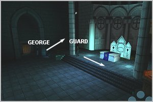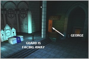 | 01) Stand close to the wall as far forward as possible (see GEORGE in DIAGRAM 1) | | 02) Wait for the guard to face away from you (see GUARD in DIAGRAM 1) | | 03) Move in the direction of the arrow (past the pulpit) and hide behind the pillar | | 04) Now wait, standing right up against the pillar and not too far forward (see DIAGRAM 2) |