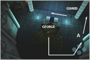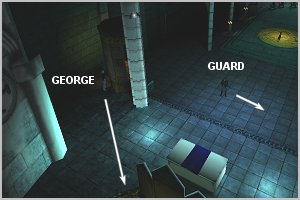 | 01) Stand close to the wall as far forward as possible (see GEORGE in DIAGRAM 4) | | 02) While the guard is facing away walk to the area indicated by the arrow (see DIAGRAM 4) | | 03) Wait for the guard to move in the direction of the arrow | | 04) Run to the rear wall, then behind the screen, staying in the shadows (see DIAGRAM 3) | | 05) Wait for the guard to be in the same place as in DIAGRAM 2 | | 06) When the guard moves in the direction of the arrow get ready to move (see DIAGRAM 2) | | 07) Go straight to the pillar and hide behind it (see GEORGE in DIAGRAM 2) | 08) Slowly move back around the pillar until the pulpit is visible, then step inside Note: You cannot be seen by the guard when inside the pulpit |
