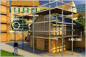 | Talk to the toilet attendant about the urinals, telling her that from above you saw that they weren't clean. When she goes to inspect the urinals, climb the scaffolding again. Without her watching, you can get to the opposite end. From there drop down to the lower level and retrieve the length of rope. Return to the opposite end to climb back up to the top level. The attendant again chases you - but you have the rope! |