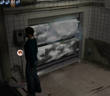 Use the scalpel on the door (to cut open the rope that had been tying it shut) to open it and enter. Move forward and you will see the giant fan whirling at the center of the floor. Across the floor, on the wall to the right of a doorway there, you will see an exposed control panel. Throw the condom (filled with water) at it. This will cause a short circuit, of course, and the fan will stop. Move across the floor to enter a room and find yet another body. Use the Action icon to slump the body to the floor. Pick up the gun from his hand, and an ID card from his jacket. You are done here, so return to the corridor.