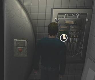 Pick up the stripped wire in your inventory and put it in the place of the old fuse you just removed. The electronic controls for the door come on. Before leaving the morgue, however, turn right and come to the glass cabinet. Open the third door to the right, move the photo stuck at the back of this glass door, and make note of the Emergency Password: 654321.
