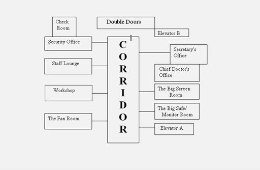 Return to the door. Press (the Action icon) the red button on the electronic control, to open the door. Exit the Morgue. Move down to approach the elevator (which is to the left of the door with the ladder sticking out). Press the call button to the left of the elevator. Enter the elevator as it opens. There are only two buttons on the panel. Press the upper one. The elevator moves up an unknown number of levels. Step out to find yourself in a corridor with offices on either side. (See map below – You entered through "Elevator A.")