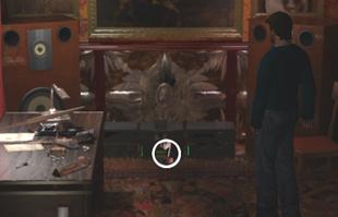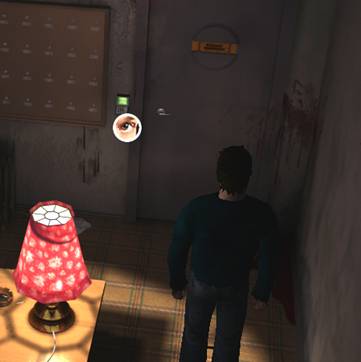 As the hero appears in the Pool room, close up on the door to your left this time. You will see that it is marked as a special entrance, and your fifth/Notebook icon will start to flash green. Look in the notebook and make note of the Special Door number: 30461. Step out of the close up, turn to your right and head for the room with the two desks now.