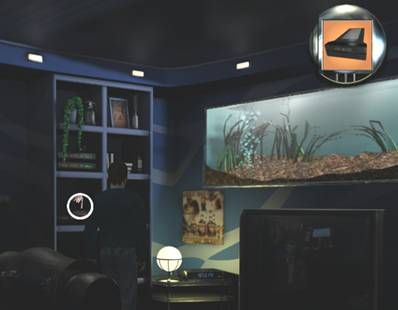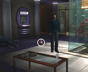 Now, enter the door to your left and you will find yourself in a large and luxurious office. Up against the wall in front of you, down on the floor, you will see a very large black stereo or entertainment system. (See the Action icon in the picture below)